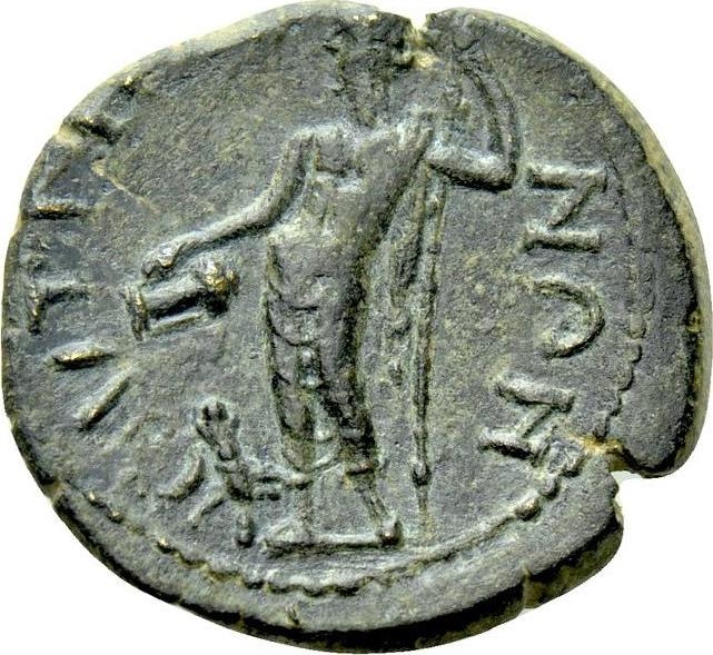 Dionysus, naked, standing left, holding cantharus in right hand over panther, left resting on thyrsus