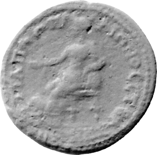 Cybele seated left, holding patera in her extended right hand, left arm resting on tympanum; at her feet, lion left |