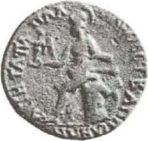 Roma helmeted seated left on pile of arms, consisting of cuirass and two shields, one round, one oblong, holding Nike on her extended right hand, sword in left |
