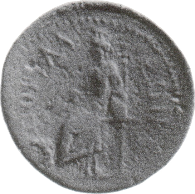 Cybele seated left, holding patera in her extended right hand, resting on tympanum with her left arm; beneath her, lion left