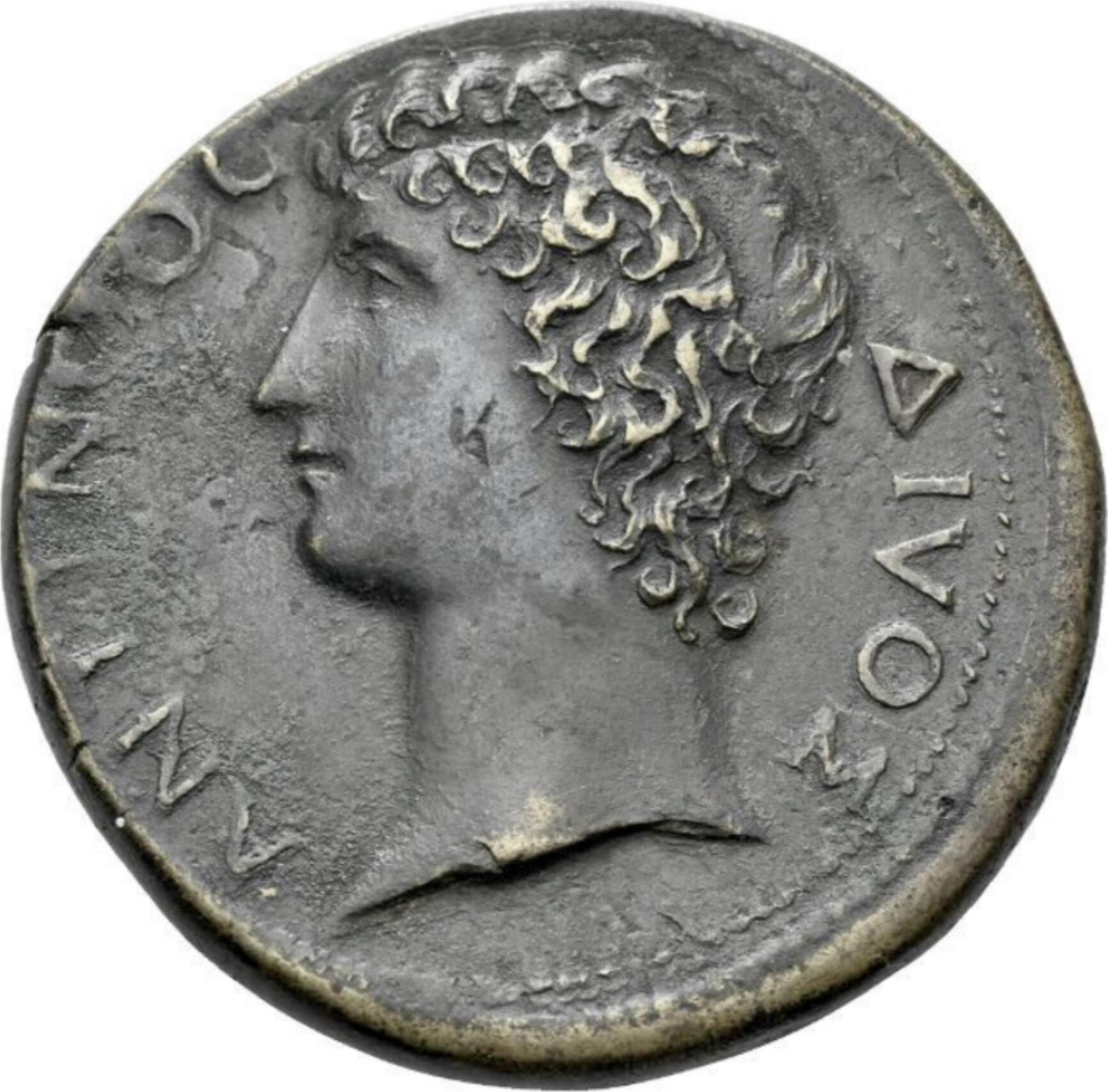façade of temple with four columns with pediment; between the columns, left and right, a niche with statue; on the upper story, three groups of statues; within the gateway, on top of four steps, shrine in which a statue; on left and right, a torch |