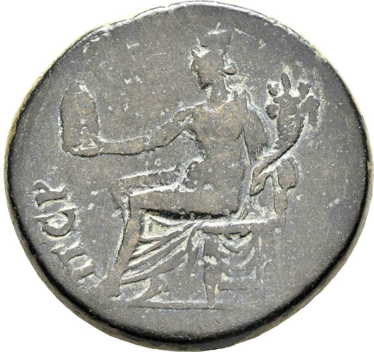 City-goddess seated left, holding cult statue of Artemis Perge with her right hand, and cornucopia with her left