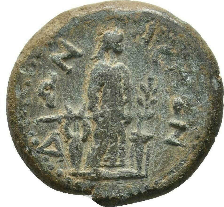Apollo in long chiton standing right, holding plectrum in right hand; lyre to left, tripod and laurel branch to right