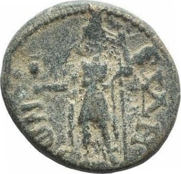 Apollo Sidetes standing facing, head left, holding pomegranate in his extended right hand, left resting on sceptre