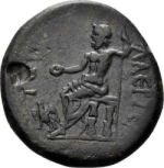 Zeus seated, left, holding patera in his extended right hand, left resting on sceptre; at his feet, eagle