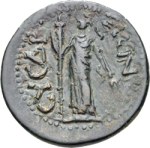 Demeter standing facing, holding lighted torch in her right hand and ears of corn downwards in left
