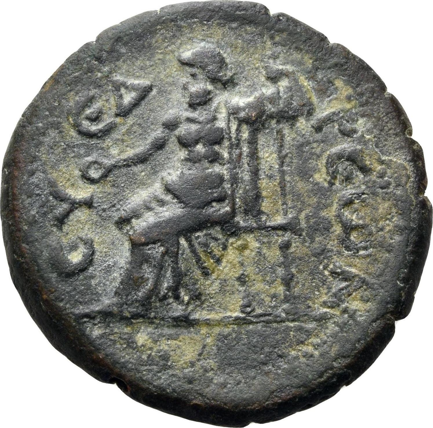 Zeus seated left, holding patera and sceptre