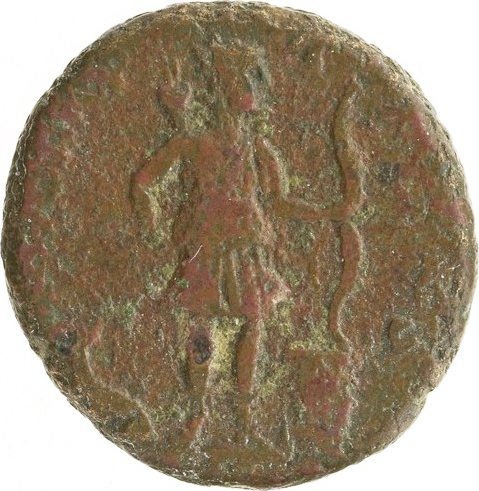 Artemis Laphria standing facing, with short chiton and chlamys, quiver at left shoulder, right hand on hip, holding bow in left over altar; at her feet, dog looking back, left