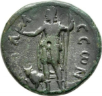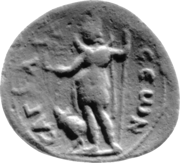 Mên standing left, wearing Phrygian cap, short chiton and chlamys, crescent behind shoulders, holding Nike on his extended right hand, resting with left on sceptre; behind, bull