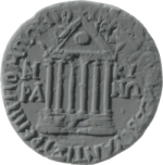 temple with six columns (temple of Roma and Augustus) on podium with steps; in pediment, globe |