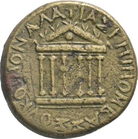 temple with six columns on podium with steps; pellet in the centre; clipeus in pediment; acroteria on cornices and apex