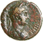 laureate bust of Hadrian, right, with paludamentum, seen from front |