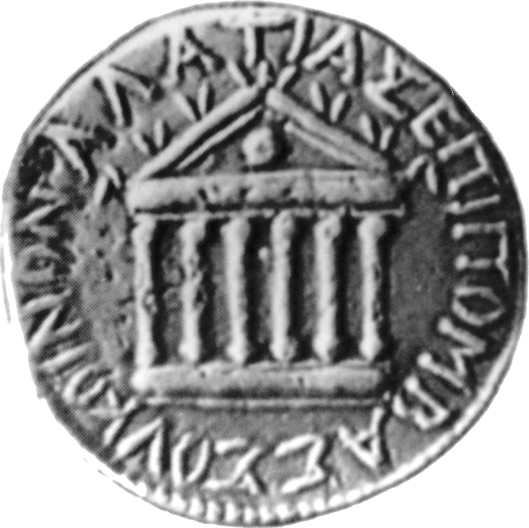 temple with six columns on podium with steps; pellet in the centre; clipeus in pediment; acroteria on cornices and apex