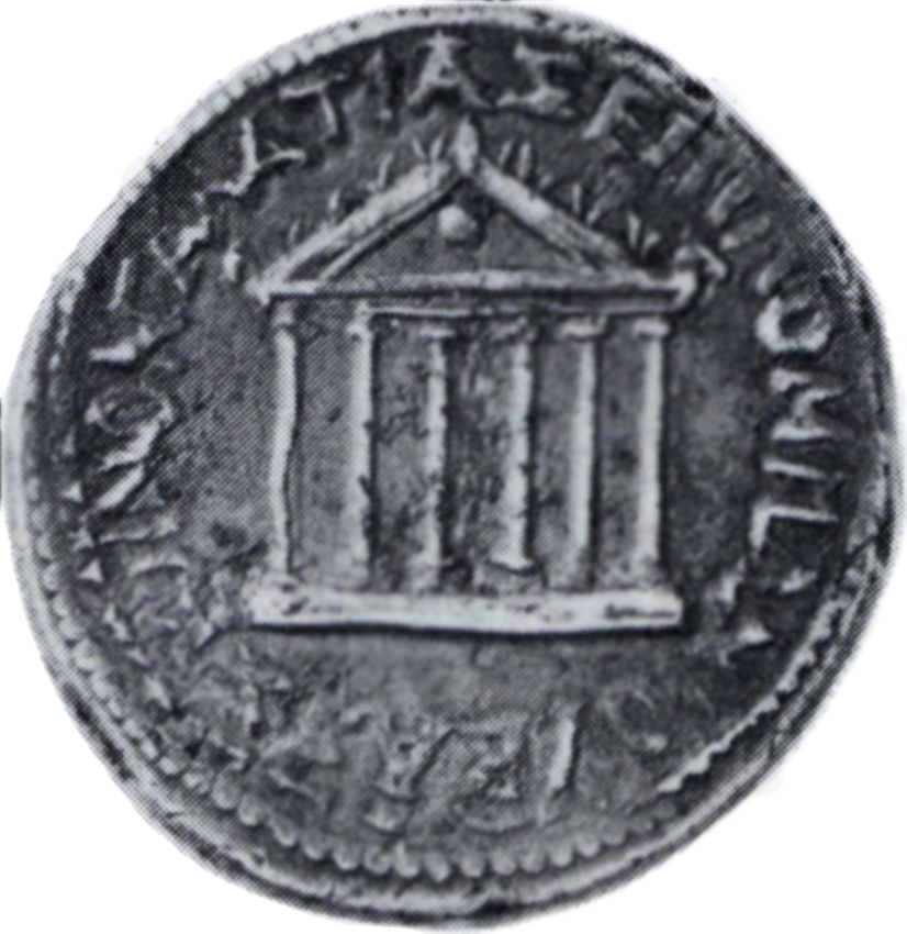 temple with six columns on podium with steps; pellet in the centre; clipeus in pediment; acroteria on cornices and apex