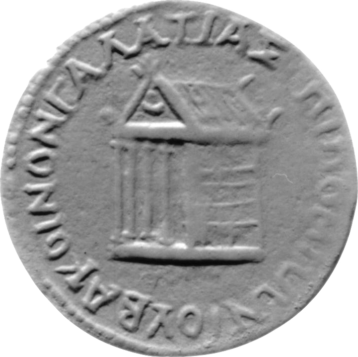 temple with five columns of Mên, in three-quarter view to left; pellet and crescent in pediment; acroteria on cornices and apex