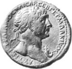 radiate figure of Enyo/Mâ standing facing, her right hand on a shield (?), a club (?) on her left arm, in the center of a temple with four columns; on left and right, Nike holding wreath standing on a base; in the pediment, eagle with wings spread; top and angles decorated |