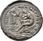 Armenia seated left on shields, head resting on right hand, left hand across right knee; in front of her, trophy with round shield at foot