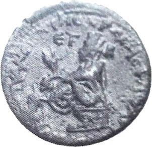 Tyche seated left, holding ears of corn and bunch of grapes in her right hand; below, river god left |