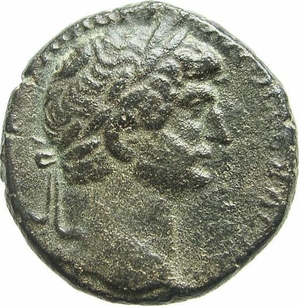 Tyche seated left on rocks, holding ears of corn and buch of grapes in her right hand, her left resting on seat; below, river god, holding club, left; in field, left and right, ΕΤ Κ; (crescent in right field) |