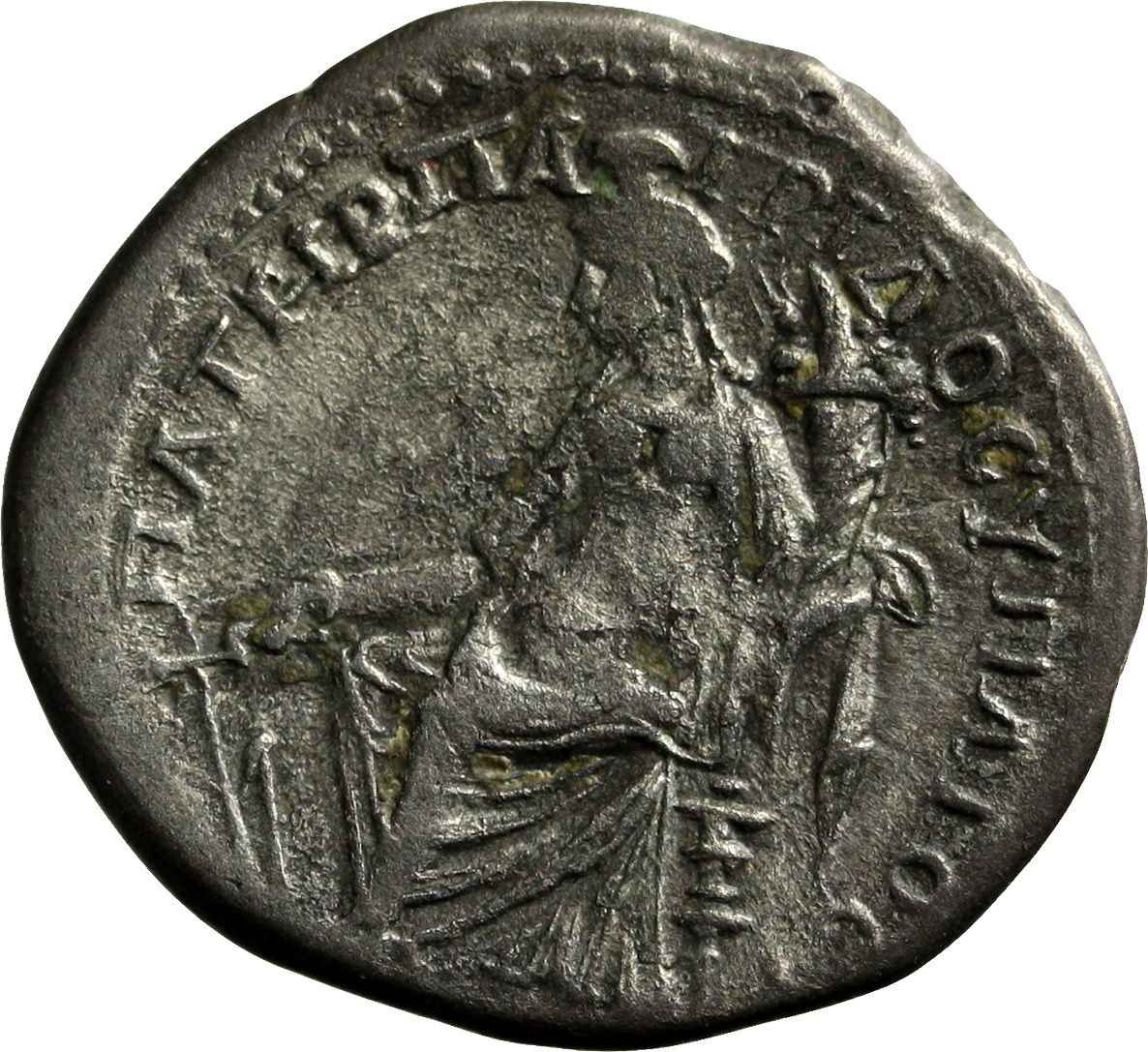 Tyche seated left holding rudder in right hand and cornucopia in left
