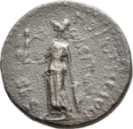 Athena standing, left, holding Nike in right hand, left hand resting on shield; in left field, ϚЧΡ