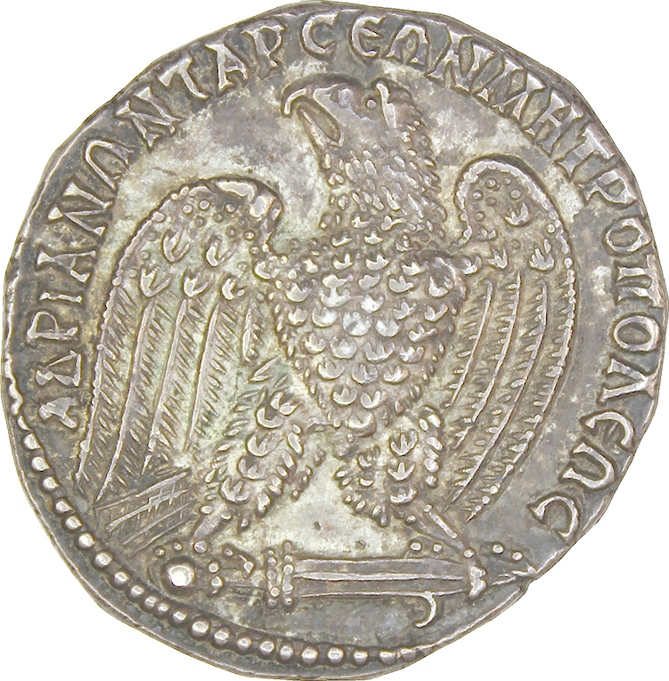 Αὐτ(οκράτωρ) Καῖ(σαρ) Θε(οῦ) Τρα(ιανοῦ) Παρ(θικοῦ) υ(ἱὸς) Θε(οῦ) Νέρ(ουα) υ(ἱωνός) Τρα(ϊανὸς) Ἁδριανὸς Σε(βαστὸς) Ὀλύμπιος π(ατὴρ) π(ατρίδος)