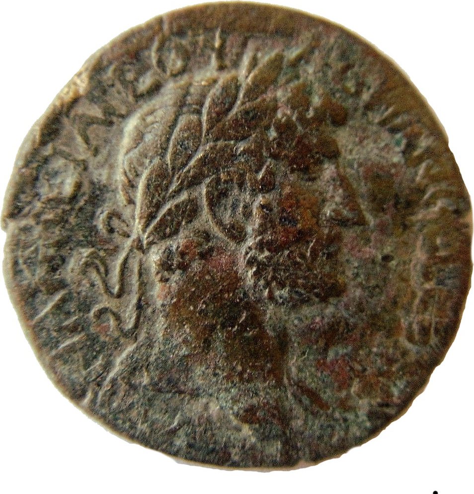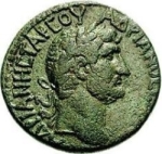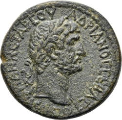 Demos, wearing himation over left arm and lower limbs, seated, left, on throne, holding wreath in right hand |