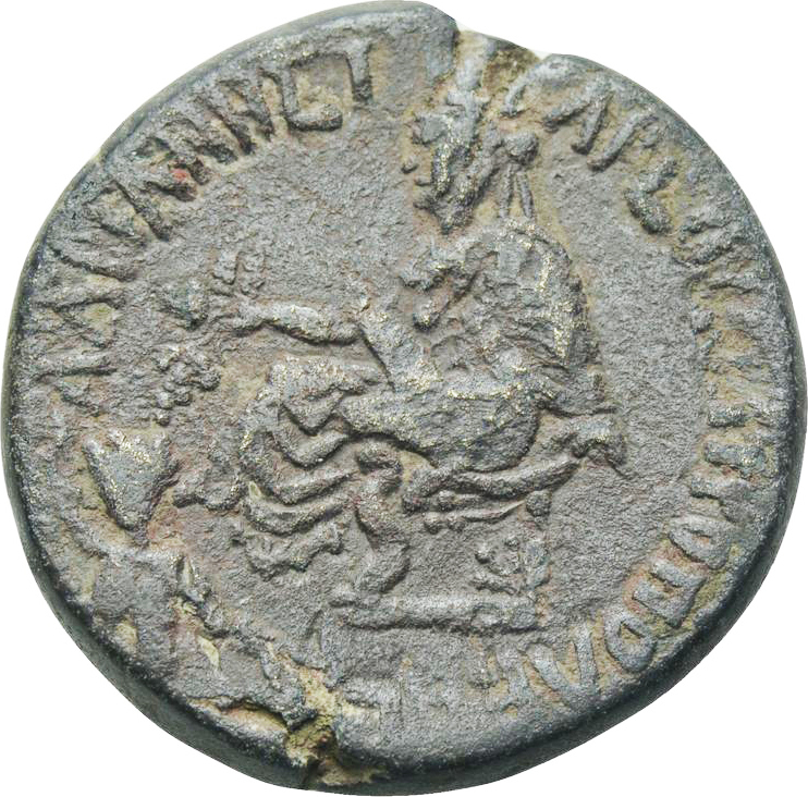 Tyche of the City, turreted and veiled, seated, left, on throne, holding ears of corn and poppy-head; at her feet, river-god Kydnos swimming, right