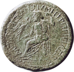 Zeus seated, left, holding Nike on his extended right hand, left resting on sceptre |