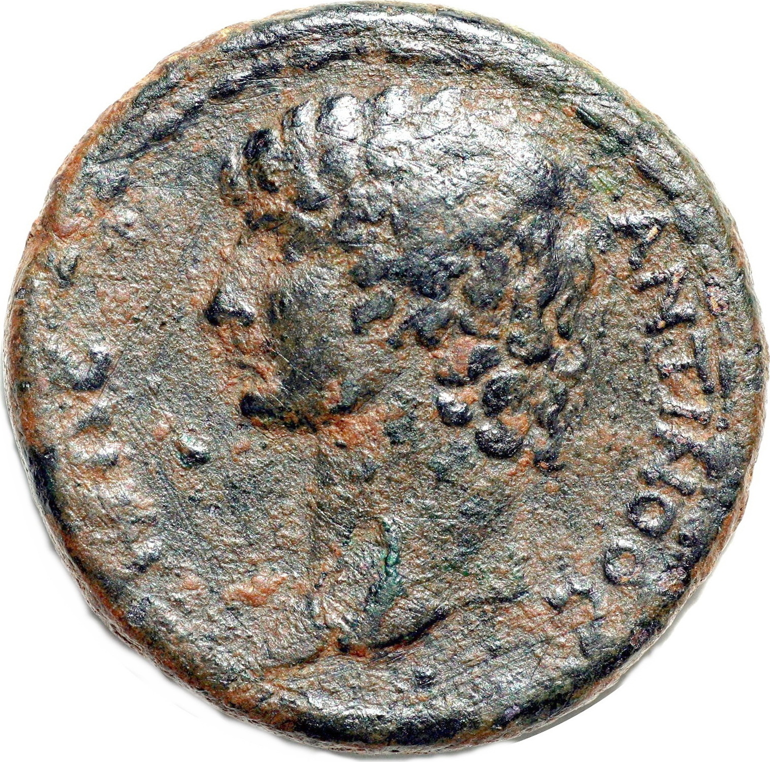 Antinous as river god Kydnos, crowned with sedge, reclining left, leaning on vase, holding cornucopia and reed; below, ΚΥΔΝΟC |