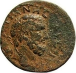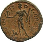 Perseus, wearing winged sandals, standing, left, holding cult statue of Apollo holding wolves in right hand, chlamys and harpa in left; at his feet, lion, left, attacking bull kneeling, left