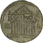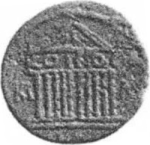 temple with ten columns on podium; in pediment, eagle wings spread standing left, looking right; inscription on architrave