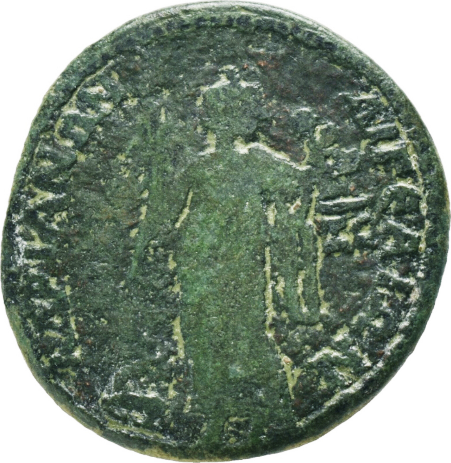 Amaltheia standing, facing, head right, wearing kalathos, holding cornucopia and infant Zeus presenting her with wreath; to left, goat