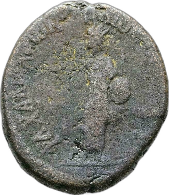Helioseiros standing facing, radiate head left , holding branch palm in his right hand, and shield and spear in left |
