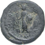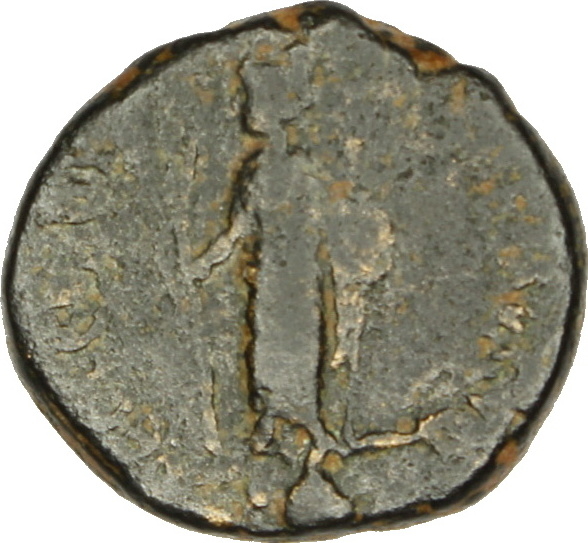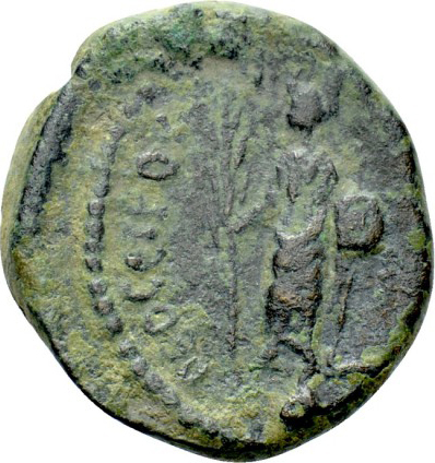 Helioseiros standing facing, radiate head left , holding palm branch in his right hand, and shield and spear in left ; in exergue, Δ