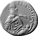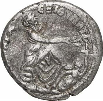 Tyche of Antioch seated on rocks, right, holding in her right hand two ears of wheat and poppy-head; at her feet, river god Orontes swimming right, looking left