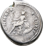 Roma seated left on pile of arms, holding Nike on her extended right hand, parazonium in left leaning on round shield