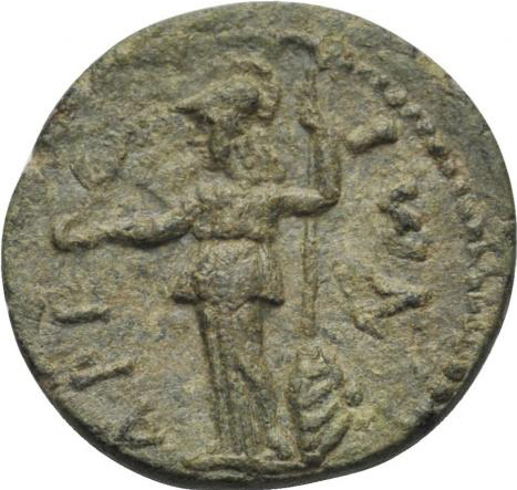 Athena standing left, holding patera in right hand, left resting on long sceptre; at her feet, right, shield