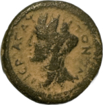 sacred stone of Zeus Kasios with fillet attached within shrine consisting of four pillars supporting a pyramidal roof surmounted by an eagle; beneath, ZEYС ΚΑСΙΟС; in field, right, Ɛ