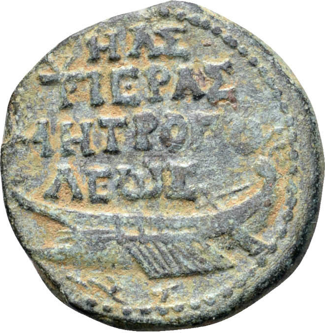 From a hoard near the Sea of Galilee (U. Leibner and G. Bijovsky, ‘Two hoards from Khirbat Wadi Hamam and the scope of the Bar Kokhba Revolt’, INR 8 (2013), pp. 109–31, at p. 129 no. 433). |
