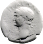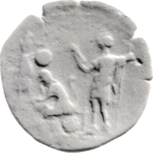 Emperor in military dress standing, left holding quiver in extended right hand, left resting on spear; at his feet, Armenia seated, left, on shield in a mourning attitude; in left field, trophy; in between Armenia and Emperor, bow and arrow? |