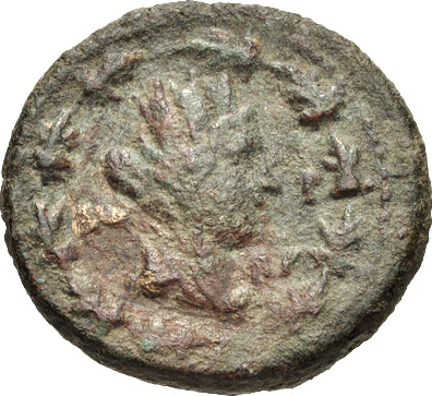 draped, veiled and turreted bust of Tyche, right, in oak wreath; below, ΠP