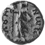 Tyche standing left, pouring from patera over altar and holding cornucopia; in right field, ΑΟΡ