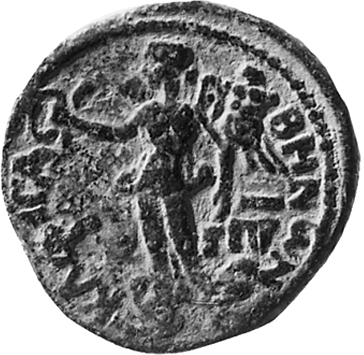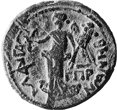 Nike advancing left, holding wreath in her right and trophy on left shoulder; in field, right, ΓΠΡ