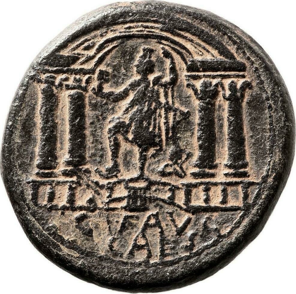 laureate head of Trajan, right, with drapery on shoulder |