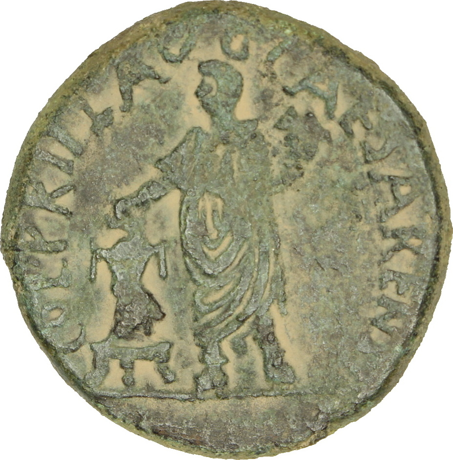 laureate head of Trajan, right, with drapery on shoulder |