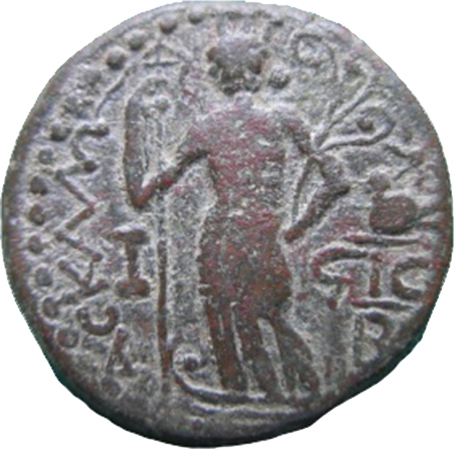 Tyche-Astarte standing, left, on prow with standard and aphlaston; in left field, incense altar; in right field, dove standing left