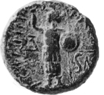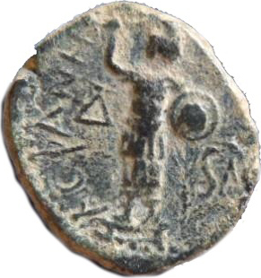 war-god Phanebal, standing left, holding harpa (?) in right hand and small round shield and long palm branch in left hand |