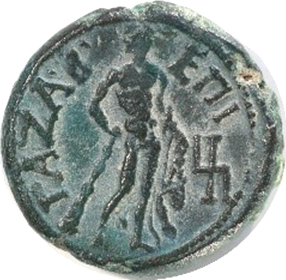 Heracles standing right, with club and lion skin; to right, 𐤌