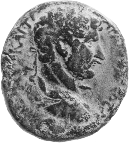 Io, in long dress, standing right, and City-goddess, in long dress, turreted and holding cornucopia in her left hand, clasping hands |